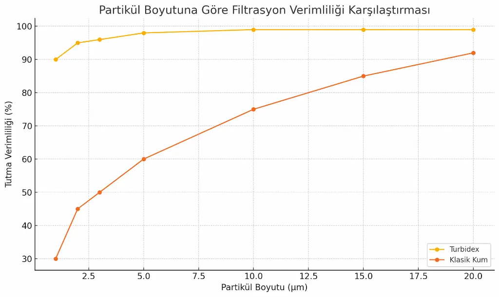 Yukarıdaki grafikte, Turbidex ve klasik kum medyasının farklı partikül boyutlarında tutma verimliliği karşılaştırılmıştır. 3-5 µm bandında Turbidex’in %95+ seviyelerine çıktığı, kumun ise %50 civarında kaldığı net olarak görülür. Bu grafik, tesis tasarımında hedef bulanıklık değerlerine ulaşmak için gerekli yatak derinliği ve servise debisi seçimlerine ışık tutar.